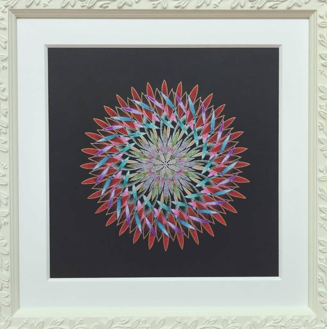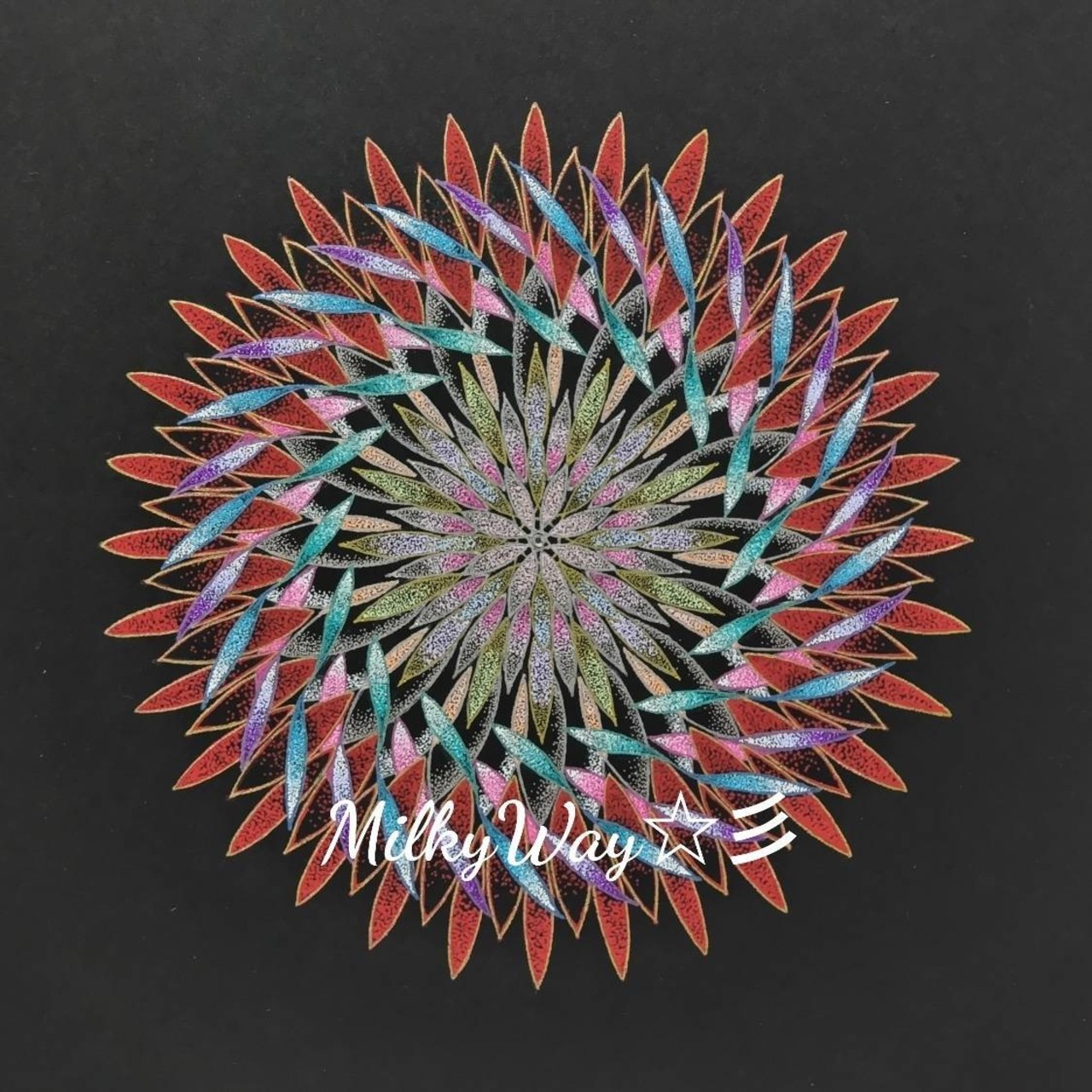 コンパスと定規、シャープペンシルを使って下図を描き、そこに生まれた形に導かれながら、黒い紙の宇宙に光を降ろしていくように直感を信じて、カラーペンでひと粒ひと粒点を打って描いています。
